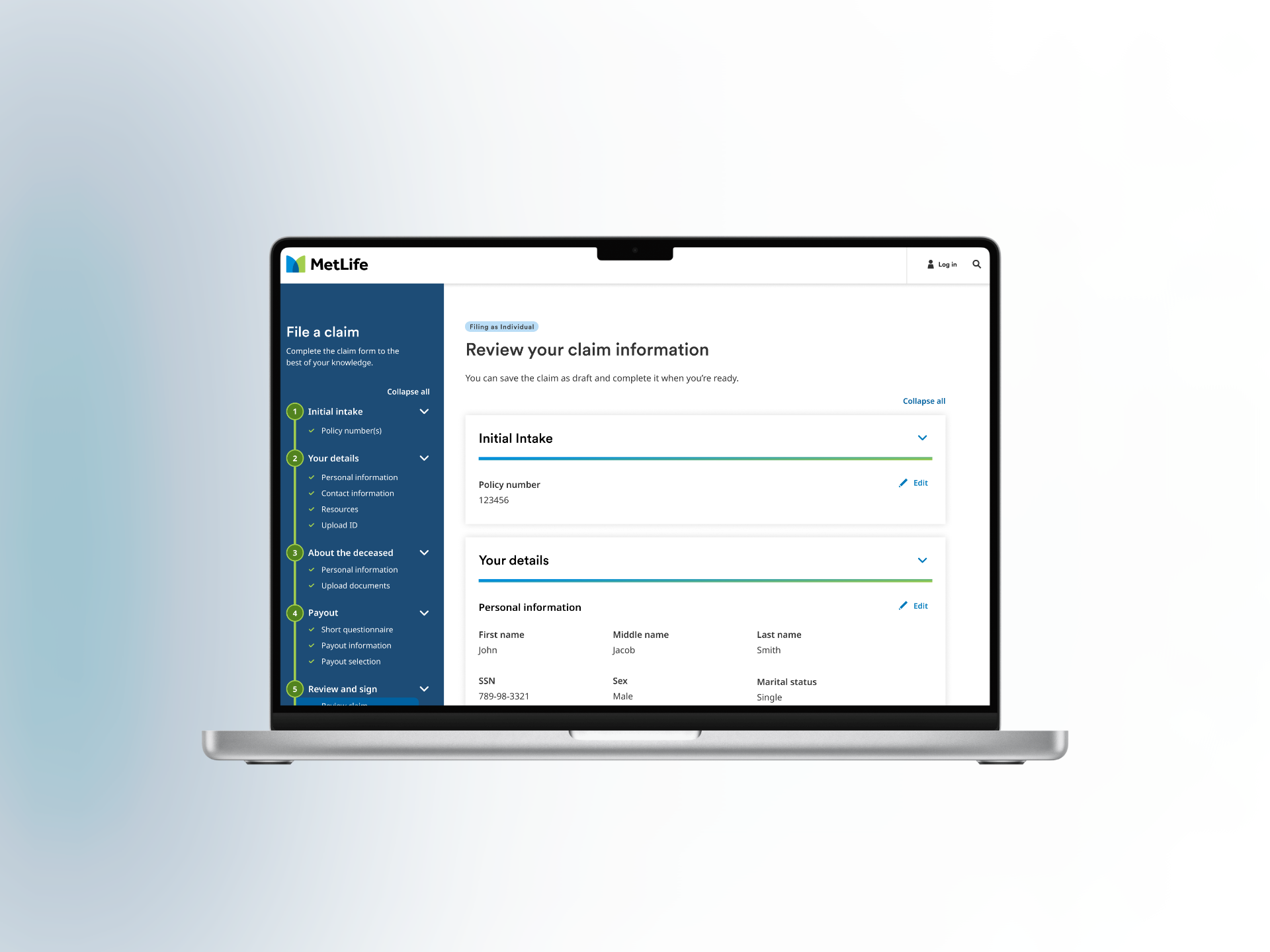 Redesigned sensitive customer-facing flows including death-claims intake, post-intake claims tracking, and profile management — improving clarity and usability across high-stakes policyholder touchpoints.