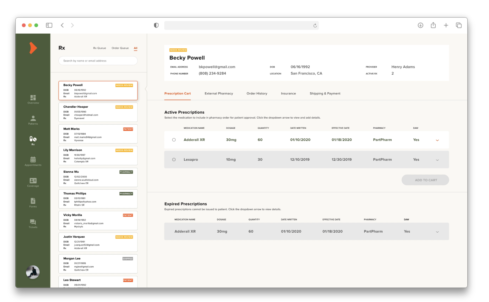A HIPAA-compliant internal platform that connects provider notes, patient data, insurance records, prescription management, and pharmacy fulfillment in one system — giving customer ops a single workflow from patient intake through medication delivery, replacing disconnected tools and manual coordination.