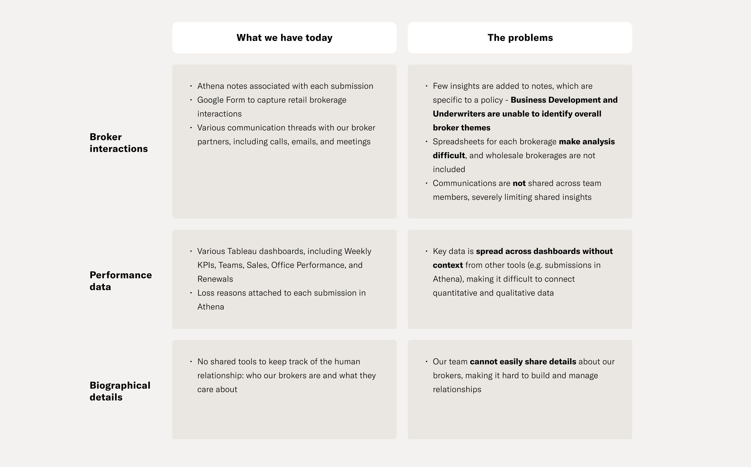 Underwriters had informal, inconsistent ways of documenting broker interactions, making it challenging to define a standard workflow to support in the tool.