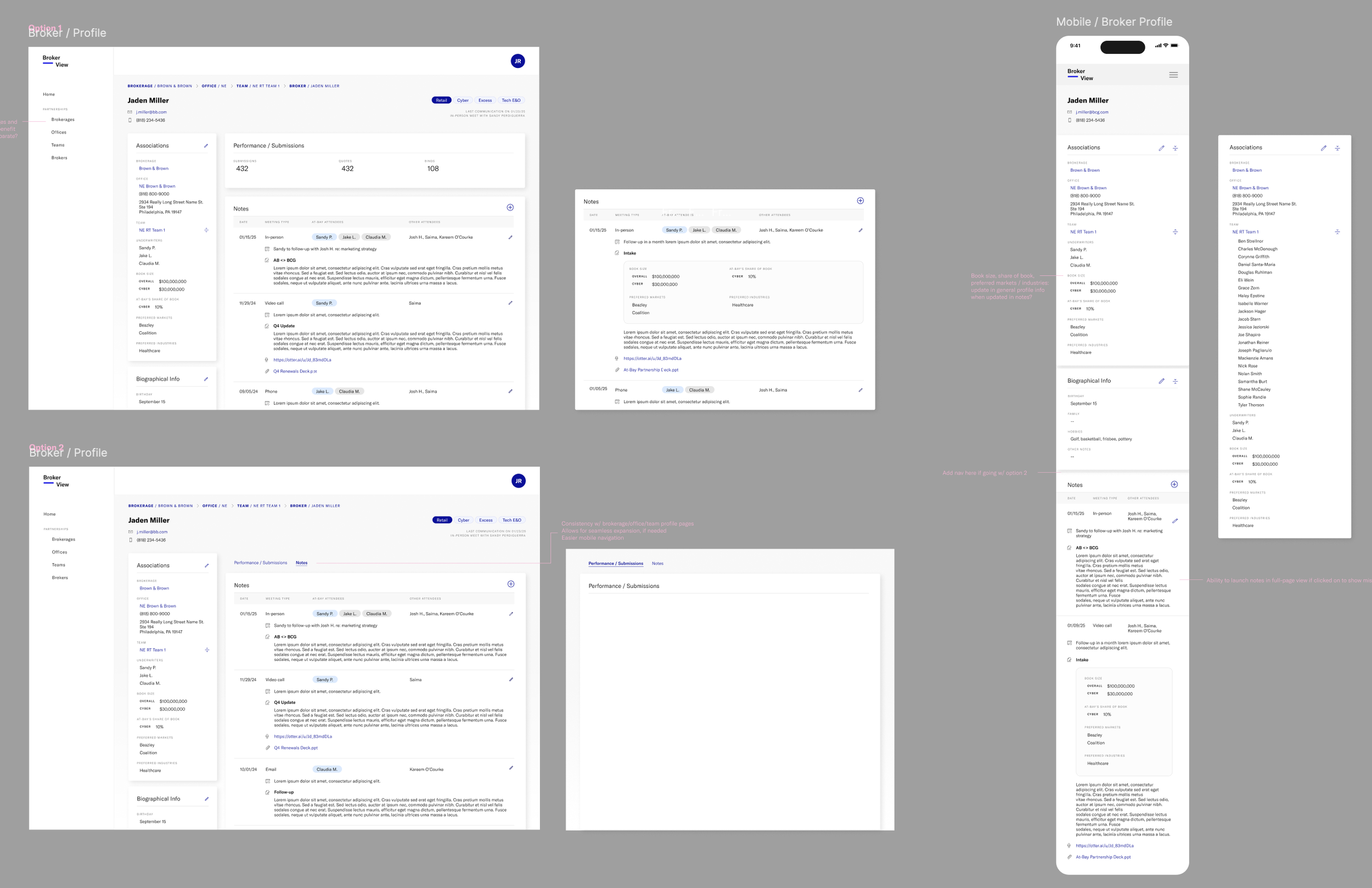To translate research insights into design, I created a series of low-fidelity mockups exploring different ways to visualize broker data, track relationship activity, and surface actionable insights.