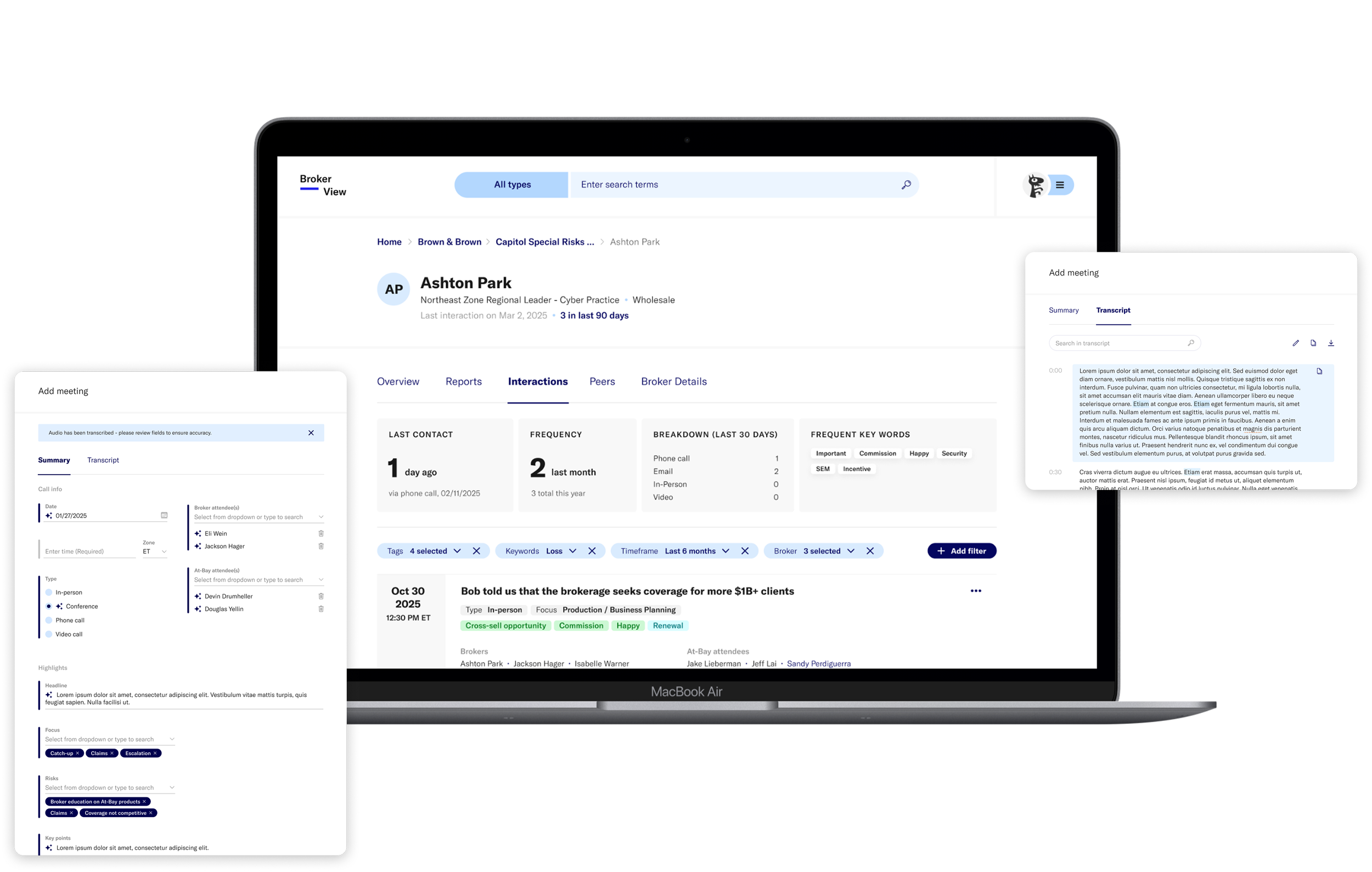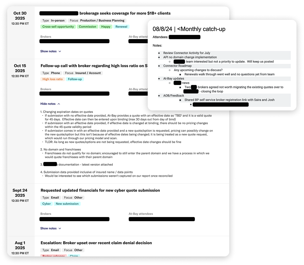 Broker knowledge lived in individual underwriters' heads. Notes from meetings — when they existed — were sparse, inconsistent, and siloed. Leadership had no visibility into what was being discussed, which relationships were strongest, or where escalations were needed.