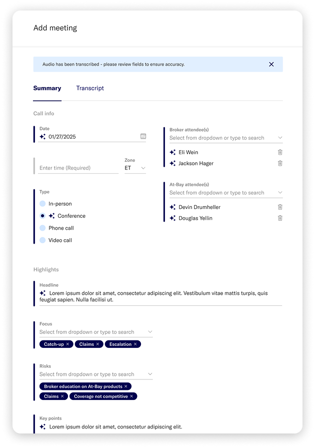 An AI transcription tool that captures and structures notes from underwriter-broker meetings — parsing recordings into key insights, follow-ups, summaries, attendees, and escalation flags that feed into the broker intelligence platform.