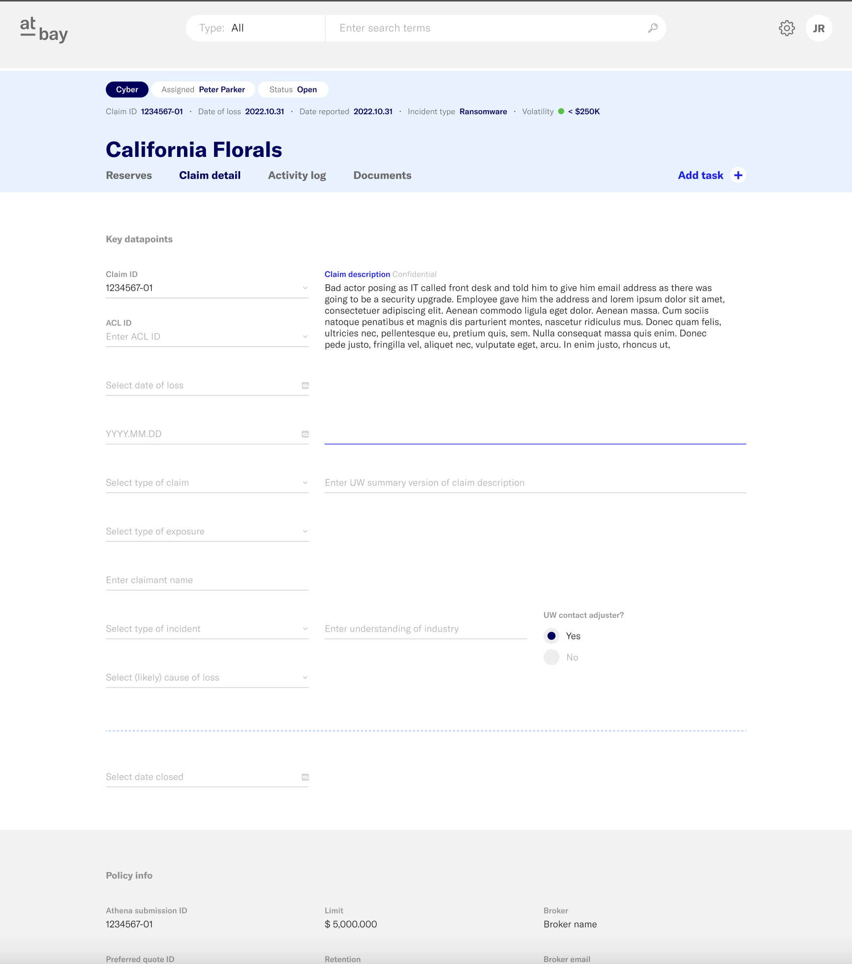 Spearheaded the design of At-Bay’s insurance claims processing workspace, partnering with engineering and operations teams to simplify complex claims workflows.