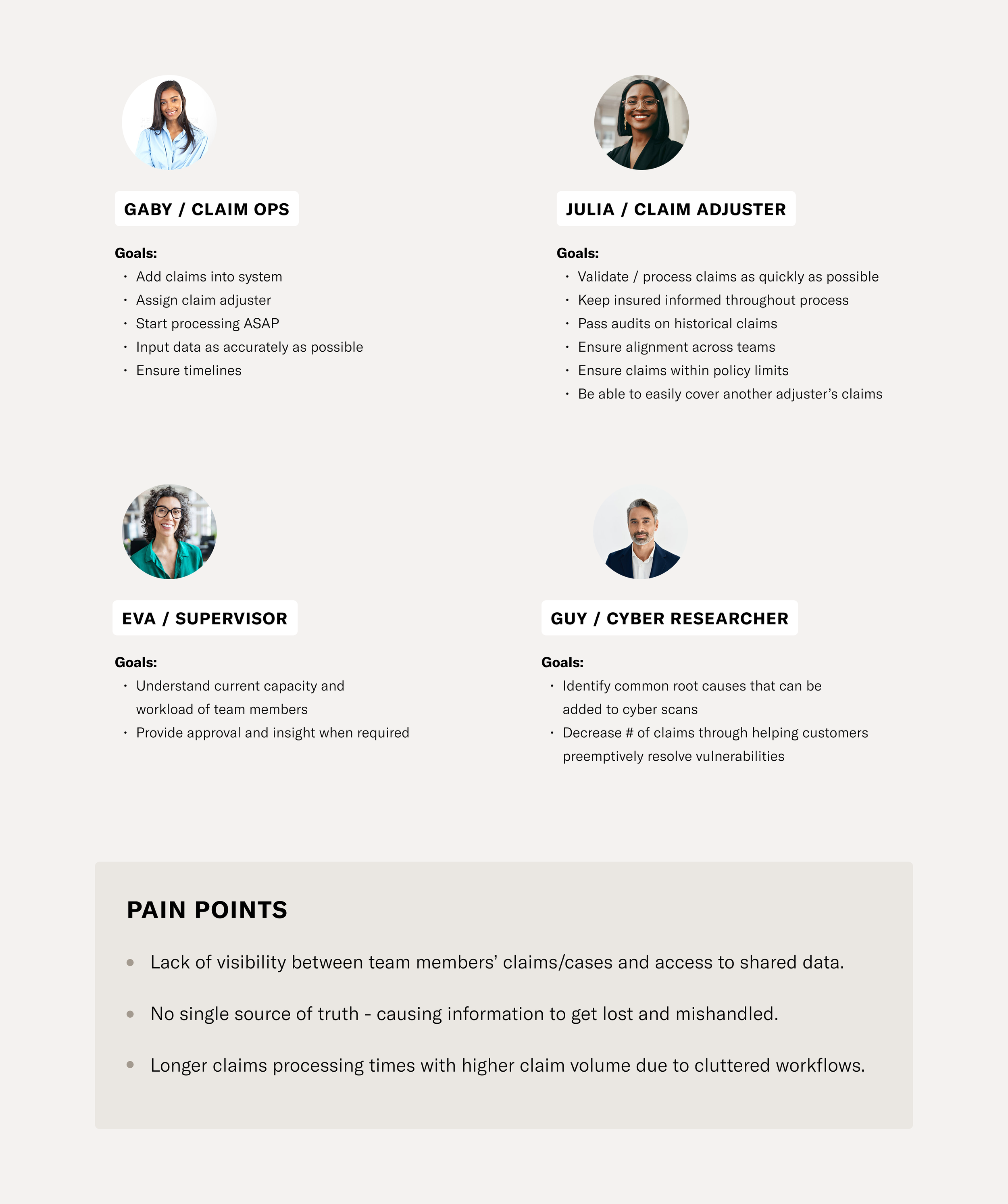 Through in-depth research and interviews with Claims Operations, Adjusters, and Managers, we uncovered critical pain points: fragmented workflows, siloed data, and the absence of a unified system.