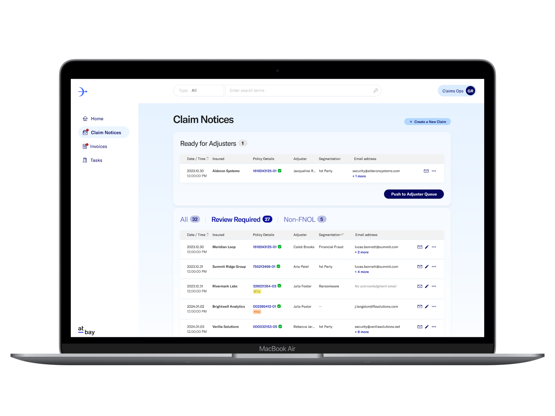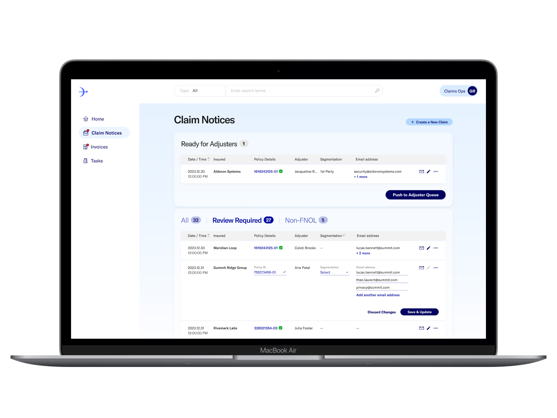 When a new claim came in, claim ops had to manually cross-reference policy data in a separate system, enter every field by hand into a tracking spreadsheet, and send acknowledgment emails individually.