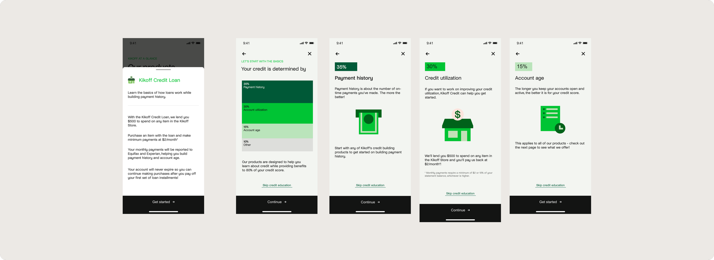 Design Kikoff’s mobile app for credit-building and credit education for low-score users